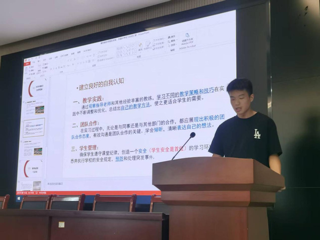 各实习小组实习生代表依次上台发言。他们立足于实习小组实际情况,从教学实践、班级管理、社团服务等方面介绍了实习工作、生活、学习情况,对实习收获和反思进行了总结,并针对存在问题提出改进措施。历时十八周的实习工作,同学们不仅提升了教学能力和个人素养,也促进了理论知识向实践能力的转化。