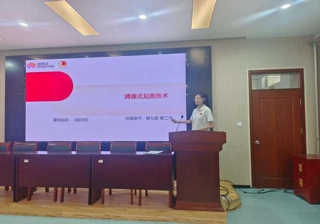 会议伊始,韩军梅介绍了出席会议的领导、嘉宾、老师和会议流程。之后,两位青年教师依次进行课堂教学展示。宋玉洁以《蹲踞式起跑技术》为题,通过视频导入课堂,条理清晰地讲解起跑器的组成与安装方法、起跑技术的三个阶段,并运用口诀帮助记忆技术动作要领,让教学内容更易理解;苗舒蓓则选取《篮球A》课程教学片段“中国篮球运动经典记忆”,通过赛事回顾、精神解读,不仅让大家重温了中国篮球的荣耀征程,更将“为国争光、顽强拼搏、团结协作”的中华体育精神融入教学,让体育育人的内涵在沉浸式体验中深入人心。