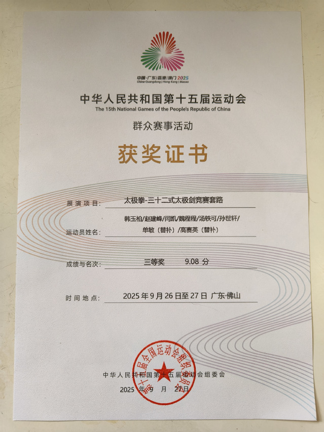 9月27日,第十五届全国运动会群众展演太极拳项目决赛在广东佛山高明赛区圆满落幕。在本次赛事中,山东队表现亮眼,公司谈球吧官方网站魏程程老师作为山东队成员,参与太极拳——三十二式太极剑竞赛套路项目角逐,凭借精湛的技术与稳定的发挥,最终喜获三等奖,为山东队、也为公司赢得荣誉。
