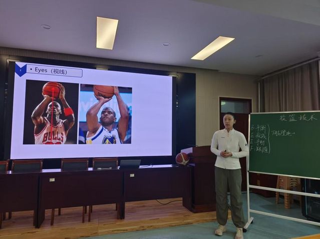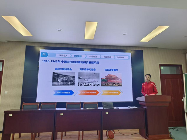 活动现场,苗舒蓓、宋玉洁两位青年教师依次进行课堂教学展示,呈现了风格鲜明的教学片段。苗舒蓓以“如何提高投篮命中率”为核心主题,通过一组真实的员工投篮命中率数据自然导入课堂,不仅系统讲解了篮球投篮的BEEF原则与命中率影响因素,还创新结合NBA球星比赛视频,引导分析高命中率背后的技术逻辑,并以四字口诀提炼技术要领,让专业知识既严谨又生动,充分彰显篮球运动的独特魅力。宋玉洁则聚焦“中国田径的萌芽与发展”,以时间为轴梳理1910年至今的中国体育发展脉络,尤其以《天津青年》杂志提出的“奥运三问”为情感切入点,生动再现了中国百年体育事业从落后到崛起、由弱变强的奋斗历程,传递出深厚的体育文化底蕴。