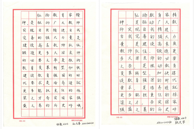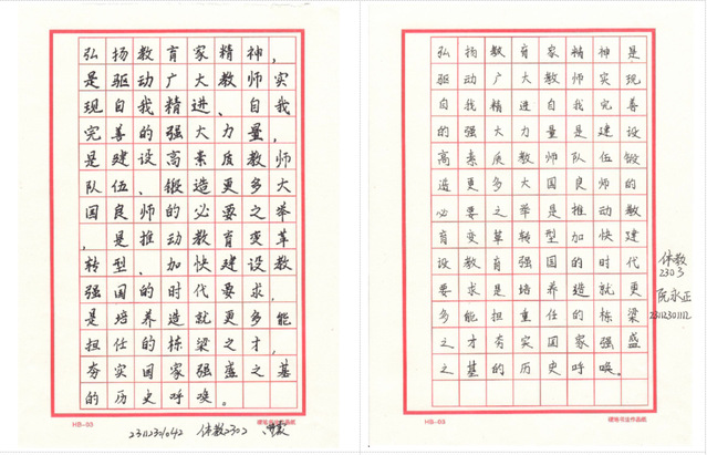 11月20日上午,比赛工作小组组织参赛员工在13-415、420进行钢笔字考察,限时10分抄写了一段指定文本,钢笔字考察的同时进行了一次师德修养教育,进一步强化了师范生教育情怀。