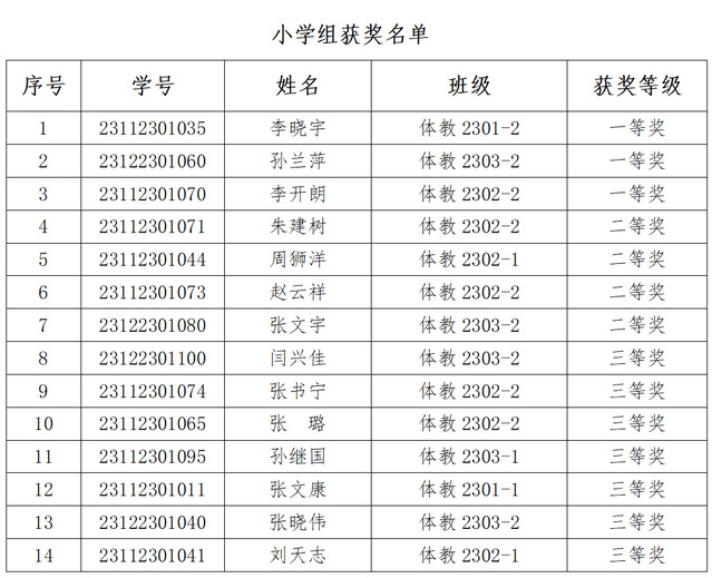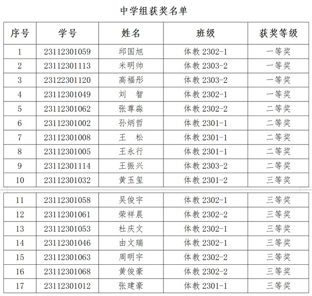 比赛工作小组根据比赛综合成绩计算办法汇总参赛选手各项目成绩并进行成绩排名,按照每组别参赛选手人数的相应比例分别授奖,一等奖10%、二等奖20%、三等奖30%。经统计,李晓宇等3位同学获得小学组一等奖、朱建树等4位同学获得小学组二等奖、闫兴佳等7位同学获得小学组三等奖;邱国旭等4位同学获得中学组一等奖、张尊淼等5位同学获得中学组二等奖、黄玉玺等8位同学获得中学组三等奖。
