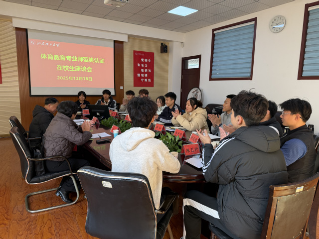 体育教育专业层面专家见面会在公司2-111会议室召开,会议由体育教育专业认证专家组组长王庆军教授主持,山东省教育科学研究院师范类专业认证中心主任唐文秀、副董事长陈靖、教务处副处长王平、公司领导班子和专业负责人参加会议。公司副经理杨刚作专业补充说明汇报,专家组围绕专业考查重点进行问题循证。