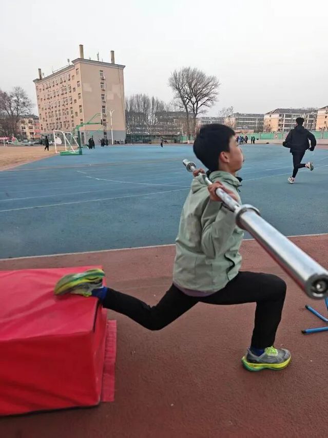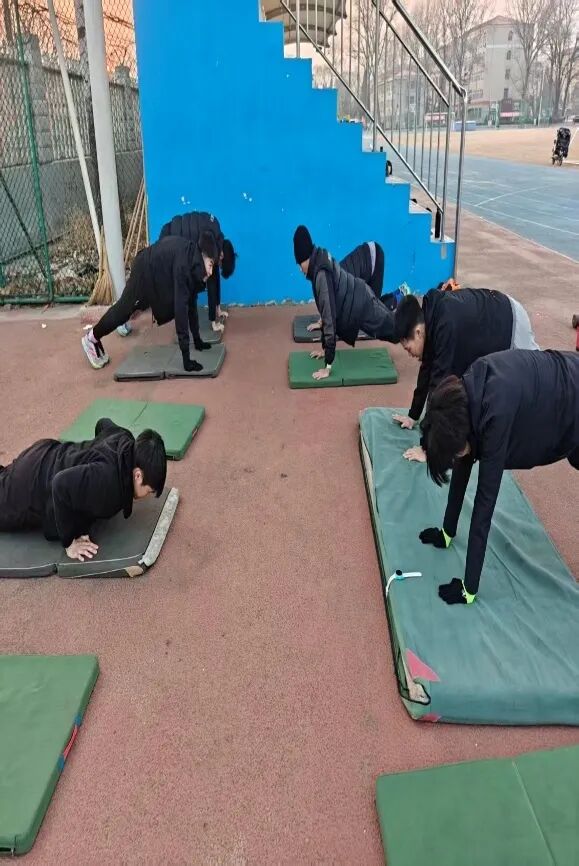 天未破晓,操场已跃动着青春身影。负重箭步蹲、弹力带抗阻、俯卧撑接力,每一次发力都凝聚着不服输的韧劲,每一滴汗水都在为突破极限积蓄能量;铅球训练场上,教练一对一精雕细琢,从预备姿态到最后迸发,让力量与技巧精准契合;傍晚的体能拉练中,整齐划一的动作划破暮色,相互鼓劲的呐喊声驱散寒意,让冬日操场满是热血温度。